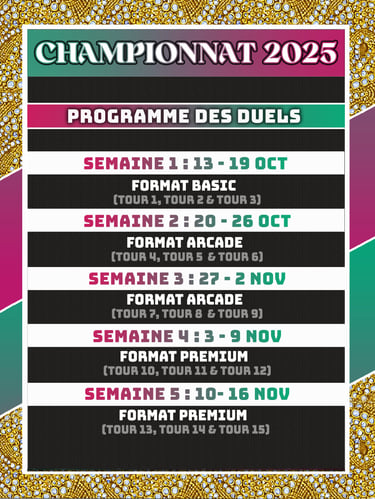 Système de jeu : Semaine 1 : Format BASIC // Semaine 2 et 3 : Format ARCADE // Semaine 4-5 : Format ARCADE PREMIUM